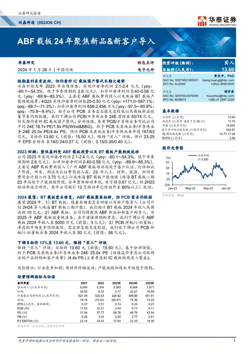 发布2023年业绩预告:实现归母净利润2.1-2.4亿元(yoy:-60.1~-54.3%,低于华泰预期的2.6亿元),扣非归母净利润0.40-0.58亿元(yoy:-89.9~-85.3%),主要受ABF载板费用投入以及珠海BT载板产能爬坡拖累;4Q23实现归母净利润0.20-0.50亿元(yoy:+171.0~587.1%;qoq:-88.7~-71.3%);扣非归母净利润656-2,456万元(yoy:-97.5~-90.8%;qoq:-75.8~-9.4%)。【慧博投研资讯】由于公司PCB业务需求能见度较低以及载板新品放量节奏仍难把握,我们下调公司PCB/半导体业务24E营收至50/14亿元,但长期仍看好IC载板国产替代。(慧博投研资讯)分部估值,参考PCB/半导体业务可比公司平均24E18.7xPE/1.9xPS(Wind&BBG),给予PCB及其他业务/半导体业务24E25.0xPE/4.4xPS,预计PCB及其他业务/半导体业务市值167/63亿元,目标价13.60元(前值:15.50元),维持“买入”评级。预计23-25年EPS分别为0.14/0.24/0.27元(前值:0.15/0.30/0.40元)。2023回顾:整体盈利受ABF载板投资以及BT载板产能爬坡扰动公司2023年实现归母净利润2.1-2.4亿元(yoy:-60.1~-54.3%,低于华泰预期的2.6亿元),扣非归母净利润0.40-0.58亿元(yoy:-89.9~-85.3%),主要受ABF载板费用投入(广州ABF载板项目尚处于客户认证、打样和试产阶段,研发、测试及认证费用投入高,23年人工、材料、能源、折旧等费用合计投入约3.70亿元)以及珠海BT载板产能爬坡(珠海BT载板一期23年尚处于产能爬坡阶段,全年整体稼动率低,共亏损0.67亿元;但2H23稼动率逐月回升,其中公司指引12月稼动率已经爬升至60%以上)扰动。