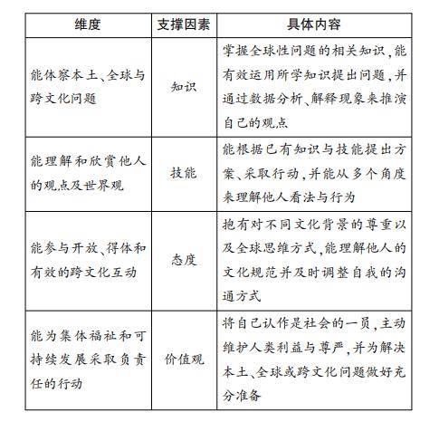 21世纪的学生生活在一个相互联系、多样化以及迅速变化的世界。新兴的数字、经济、文化、环境等正在塑造年轻人的生活,为他们创造机遇,同时也带来了挑战。更加紧密联系的外部环境要求学生能够欣赏文化差异并从中受益。2017年,经济合作与发展组织(OECD)发布《PISA2018全球胜任力框架》,将全球胜任力(global competence)定义为一个多维的终身学习目标。全球胜任力由四个相互依存的维度组成,而这四个维度又由知识、技能、态度和价值观这四个因素来支撑(见表1)。[6]