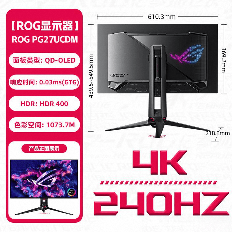 华硕ROG新品上市,推出的27英寸4K 240Hz OLED电竞显示器PG27UCDM,搭载顶级OLED屏,呈现震撼色彩与深邃黑色,240Hz超高刷新率带来极致流畅游戏体验。